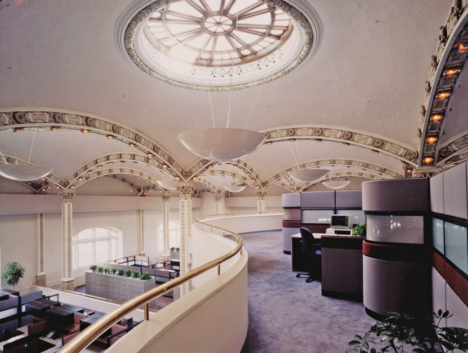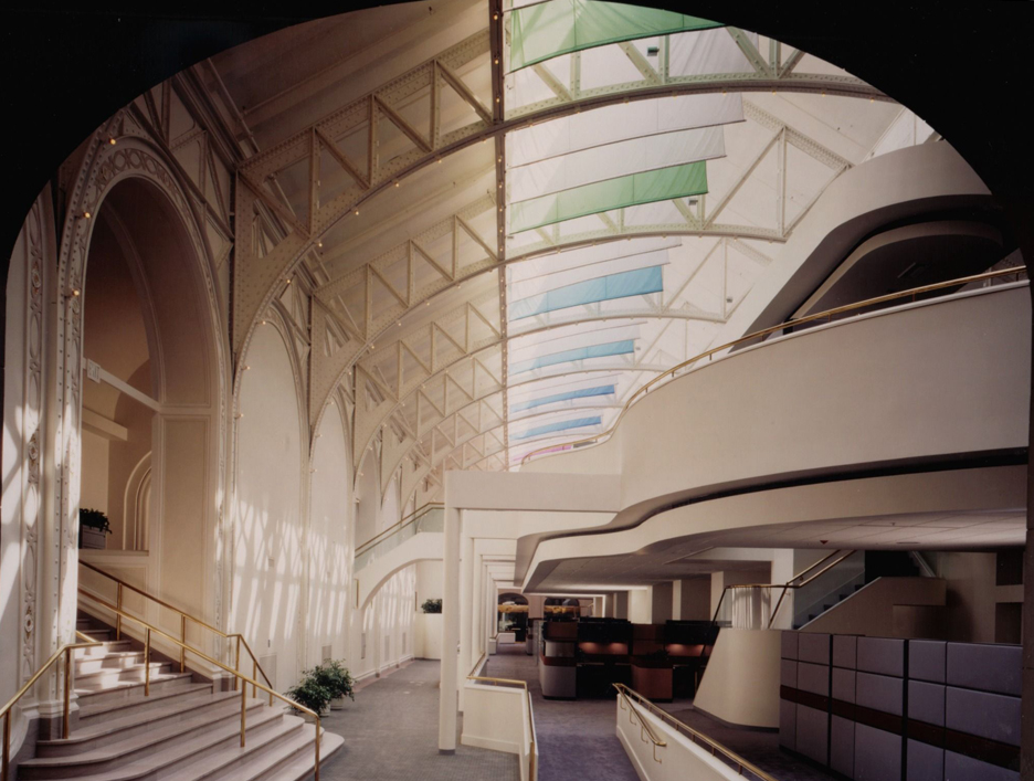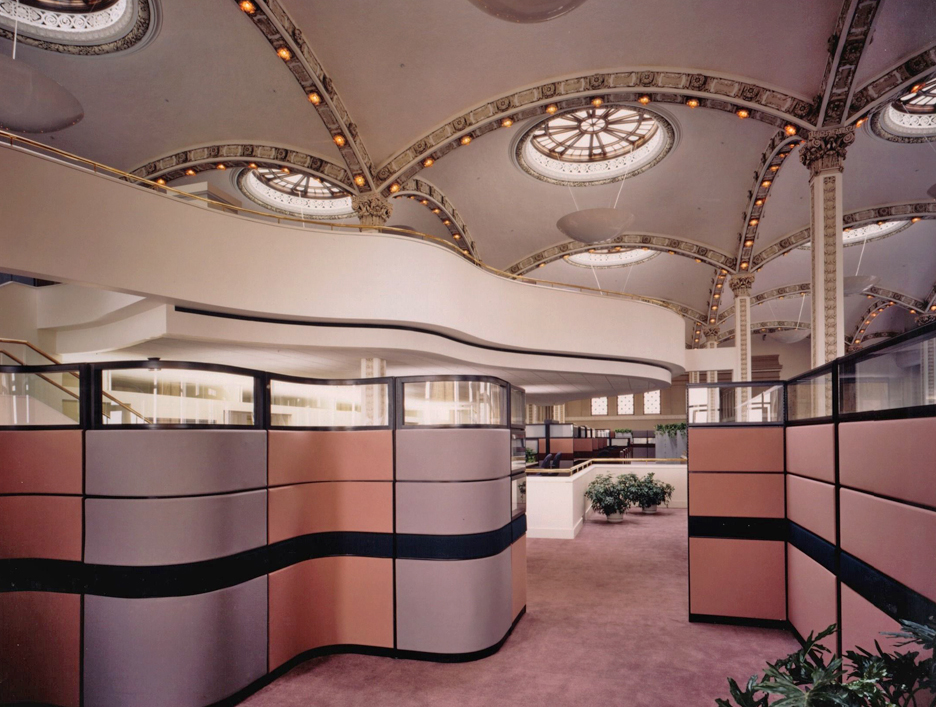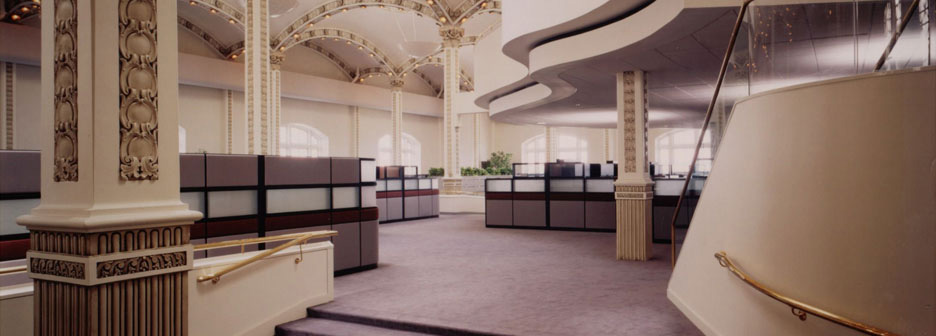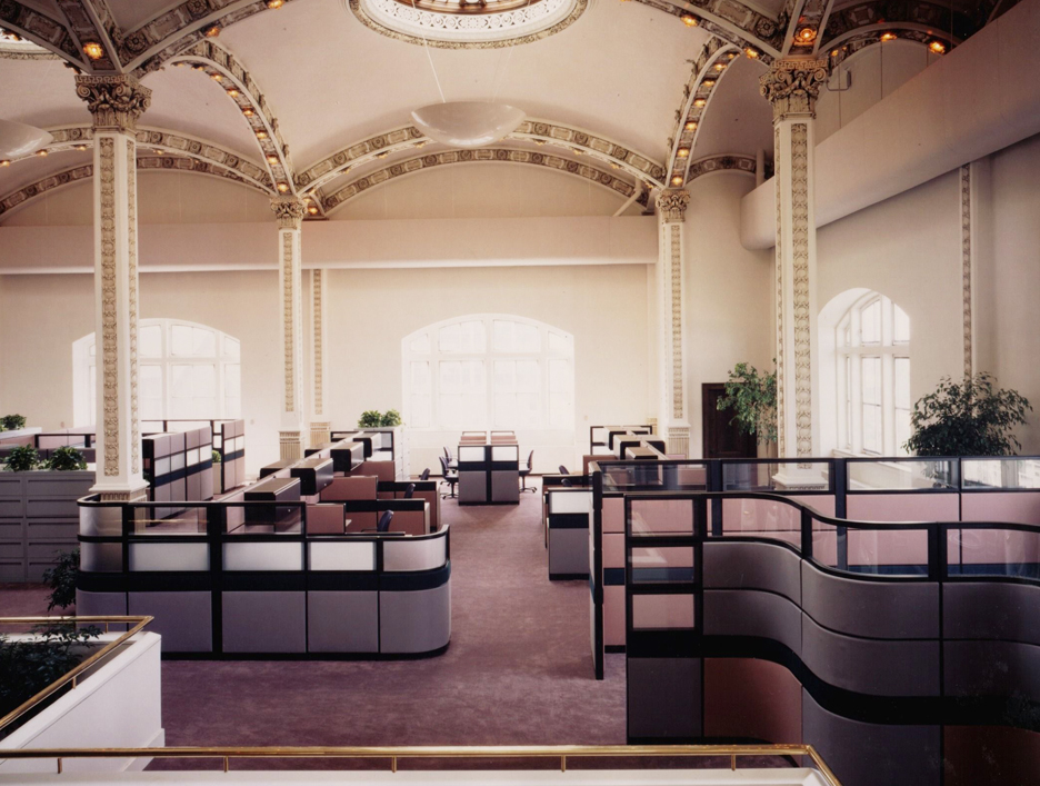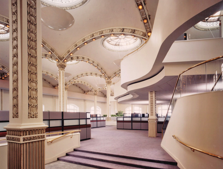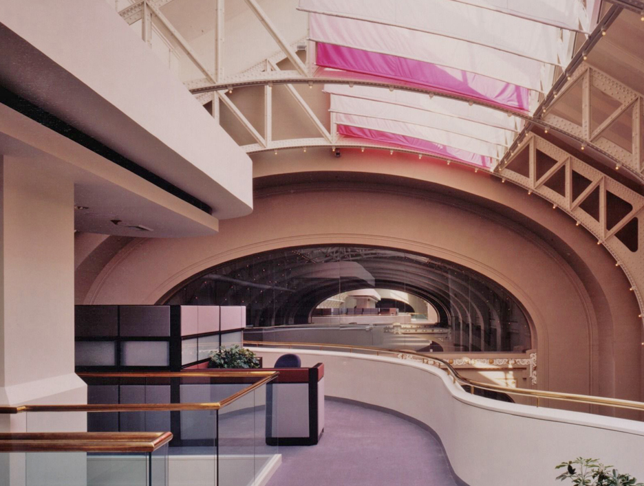 The fifth floor of the State Education building was originally designed to house dinosaur and Indian exhibits for the New York State Museum. The 70,000 square-foot, 40 foot high space, which featured high arched openings and gabled sky-lights was renovated to provide modern office facilities for the state.