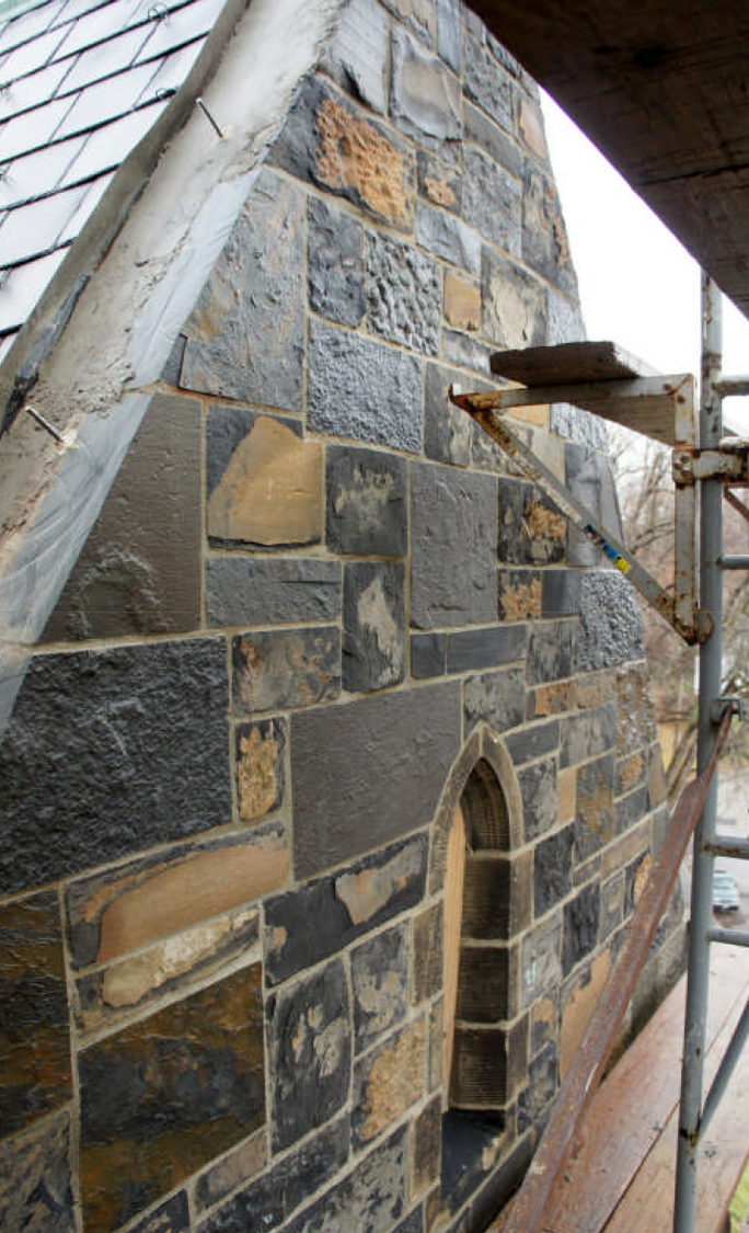 Work consisted of the Exterior Historic Restorations of the Woodside Church in Troy, NY. The bluestone façade had been partially removed and pieces numbered resulting in a life size puzzle of stones to be reset on the structure.